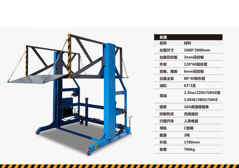 4. 安全防护:液压安全锁防意外坠落、防滑台面、防护栏 / 裙板、限位装置等。